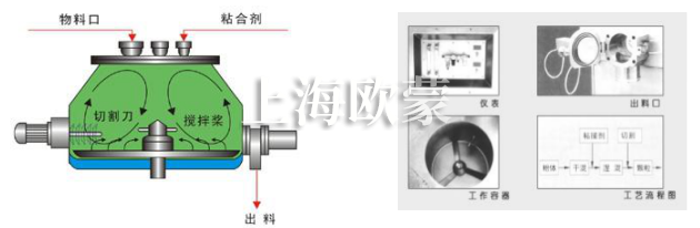 1、攪拌槳對物料干混,加粘合劑后濕混。能根據物料和粘合劑的特性使攪拌槳的旋轉速度確保運動產生渦流,物料充分混合。同時,制粒刀處交匯區域對翻騰的物料團充分打碎成顆粒;